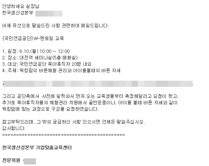 오늘은 국민연금공단에서 바른체형교육원을 통해 기업체 강의 의뢰가 들어와서
