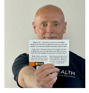 (1) 고객이 본인 팔을 쭉 펴서 차트를 직접 잡게 한다. 차트는 고객의 얼굴 정면에 둔다. 차트에서 읽을 수 있는 가장 작은 폰트의 문장을 확인한다. 그리고 그것보다 한 단계 높은 폰트의 문장에 초점을 맞추도록 지시한다. 예를 들어서 읽을 수 있는 가장 작은 폰트 크기가 9포인트라면, 고객에게 10포인트로 적힌 문장에 초점을 맞추라고 하면 된다. 그리고 그 문장의 첫 번째 단어나 문장 자체 번호에 시선을 고정시키게 한다.