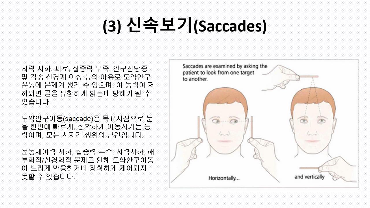 신전능력이 떨어질때 핸즈온 테크닉도 사용가능 하지만 소뇌운동으로 SMOOTH PURSUIT 사용하기도합니다.